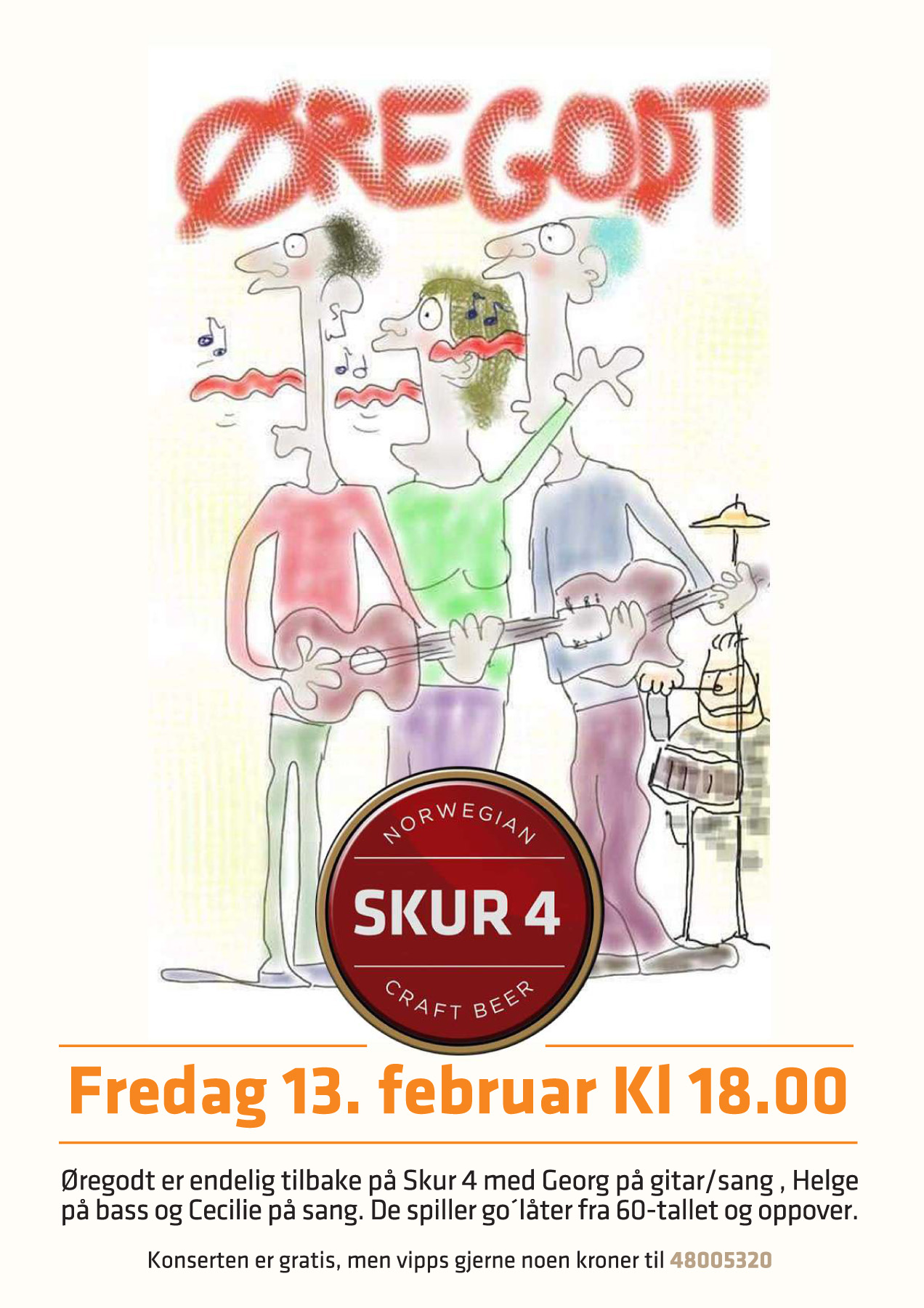 Øregodt er endelig tilbake på Skur 4 med Georg på gitar/sang , Helge på bass og Cecilie på sang. De spiller go’låter fra 60-tallet og oppover.»