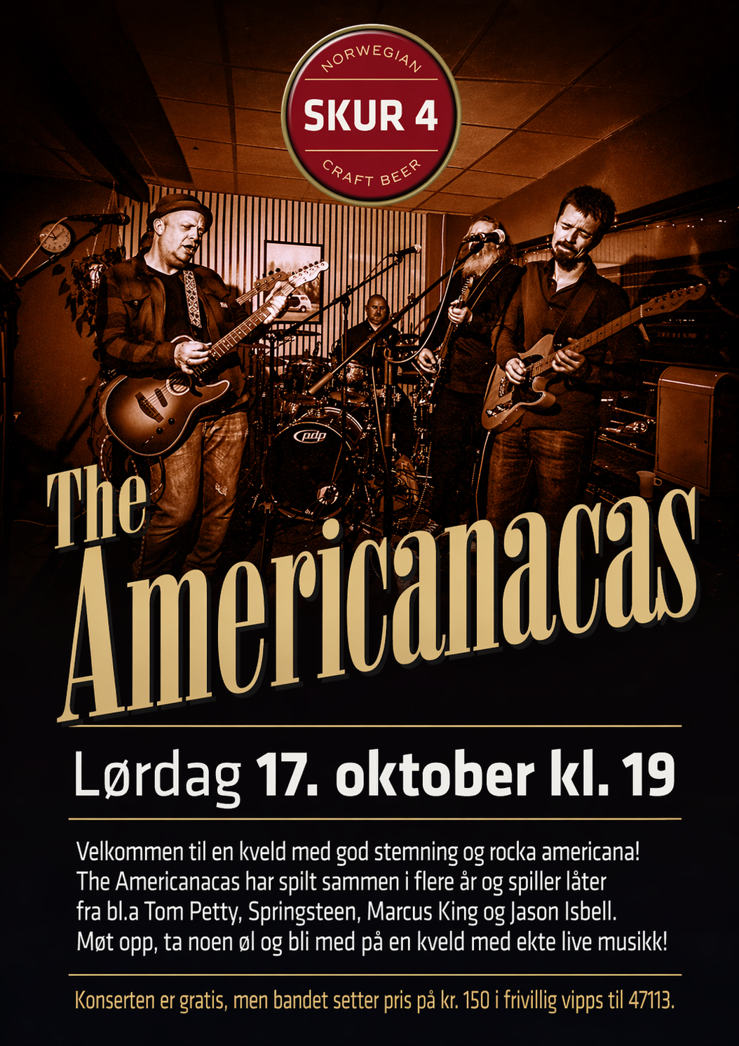 The Americanacas har spilt sammen i flere år og spiller låter fra bl.a Tom Petty, Springsteen, Marcus King og Jason Isbell. Møt opp, ta noen øl og bli med på en kveld med ekte live musikk!