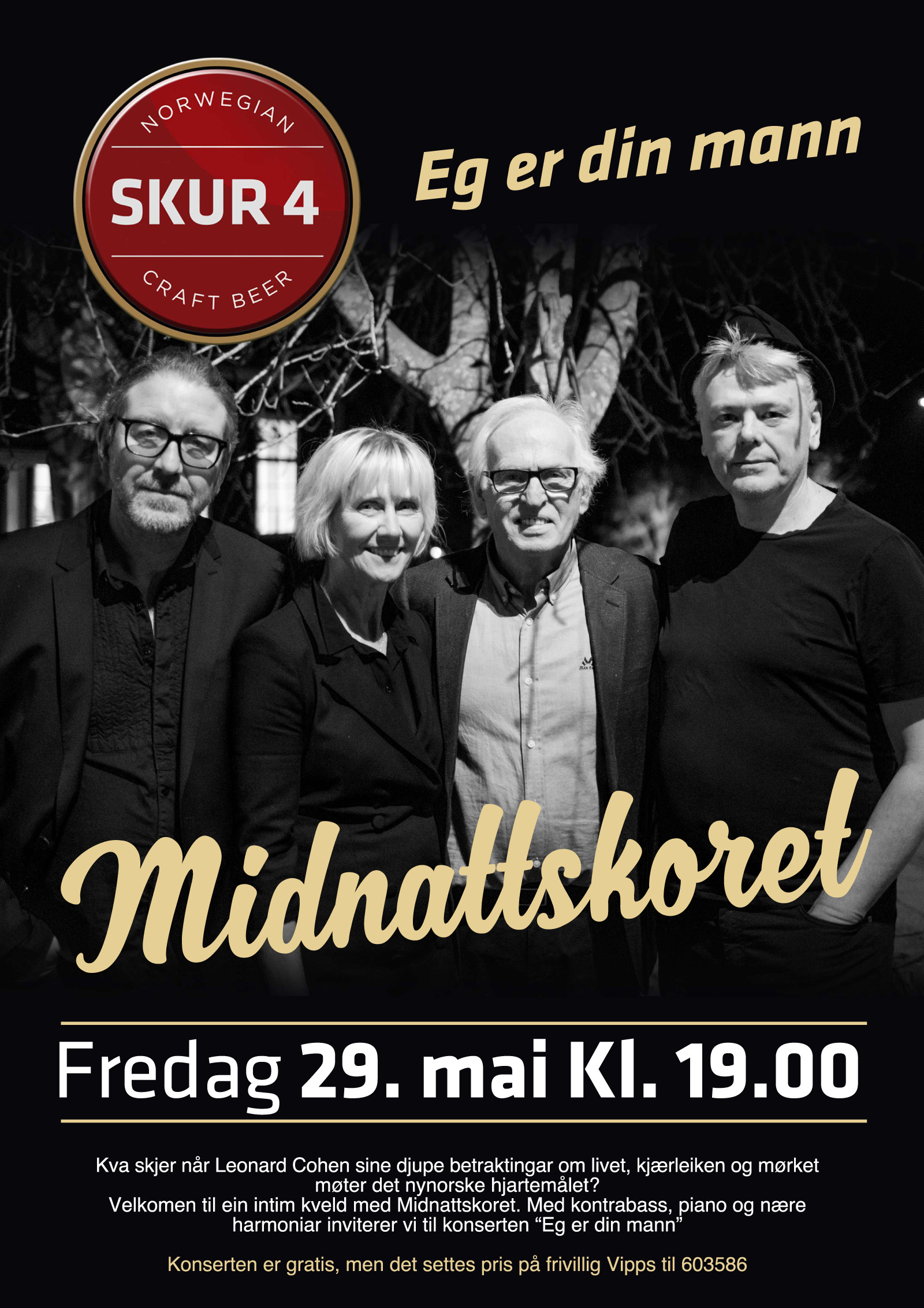 Kva skjer når Leonard Cohen sine djupe betraktingar om livet, kjærleiken og mørket møter det nynorske hjartemålet? Velkomen til ein intim kveld med Midnattskoret. Med kontrabass, piano og nære harmoniar inviterer vi til konserten «Eg er din mann». Konserten er gratis, men det settes pris på frivillig Vipps til 603586.